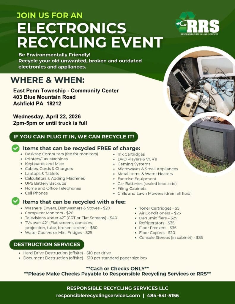 Wednesday April 22, 2026 2pm-5pm 403 Blue Mountain Rd. Ashfield, PA 18212 The Township will be hosting this event for […]